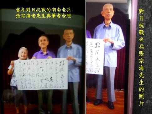 在台北我因舉行書畫展覽而認識一位現年九十四歲的建國中學退休國文老師張宗海老先生,江西省靖安縣人,對日抗戰時他在家鄉時年十七歲從軍,抗戰勝利後,台灣光復,後又發生國共內戰,國府撤退台灣,他隨國軍來台,退伍後考入師範大學國文系,畢業後到建國中學教書,至屆齡退休。他常向我求字,有一次到我的書法教室來,我便寫了一幅書法送他(如附圖合照)。最近他作了一首長詩縷述他從軍抗日的故事,我把他的大作打字如下,也可作為今年中國人民對日抗戰勝利七十週年紀念的一個曾從軍抗日的老兵的故事紀述:
