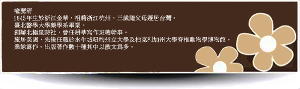 ■ 自畫像 ■ 落花 ■ 雙語詩☆鳥 ■ 愛的圖騰 ■ 父親樹 ■ 如詩●婚禮歸來 ■ 鏡子 ■ 黃山 (組詩) ■ 黃昏◆舊金山州立大學邀請鄭愁予朗讀詩作會後有感 ■ 讀周夢蝶詩◆兼致悼意
