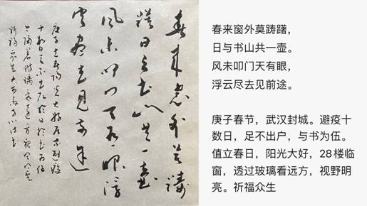 庚子春節,武漢封城。避疫十數日,足不出戶,與書為伍。值立春日,陽光大好,廿八樓臨窗,透過玻璃看遠方,視野明亮。祈福眾生。