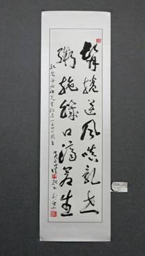 ●台北黃寶芝笛姐箋注:老師和各位學長:友佳兄的草書已達接近一代宗師于右任的境界,故台北文化界稱他為草聖,其實友佳兄的隸書亦有其獨到的風格,他的行書也如流水行雲,贏得一致好評,而我獨愛他的漂染繪畫,真是一絕,每次在他的書畫展中,我常駐足畫前流連忘返,他在台大的博理藝廊我去了不只十趟,可惜友佳兄有點吝嗇,始終捨不得割愛賜我一幅,只得引以為憾。